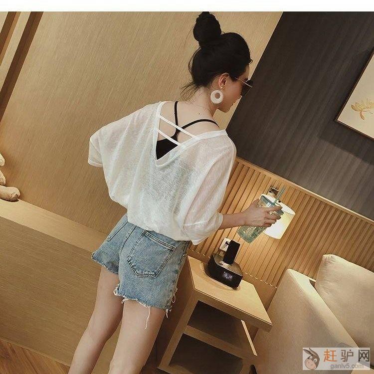 夏季新韩版清凉短袖t恤女宽松露背V领打底衫吊带两件套欢迎www.ganlv5.com