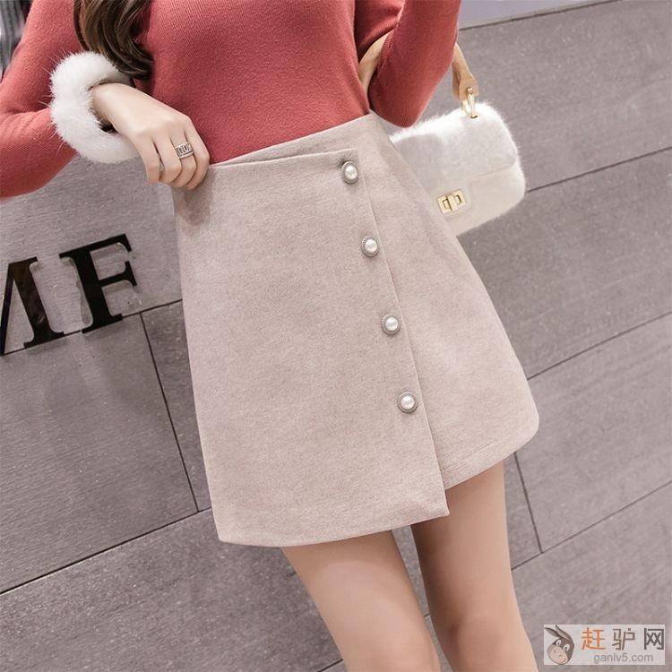 秋季新款韩版高腰百搭毛呢半身裙女不规则单排扣A字裙原文www.ganlv5.com