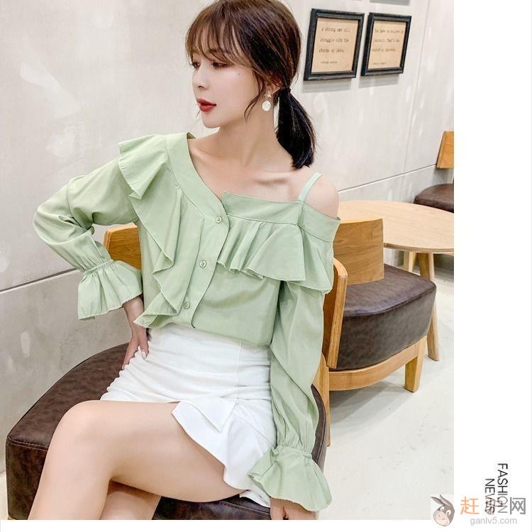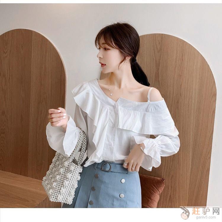 秋季新款韩版很仙的长袖露肩荷叶边喇叭袖宽松雪纺衫女赶驴网www.ganlv5.com